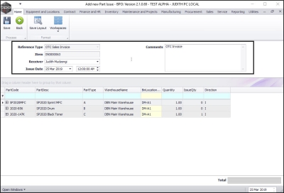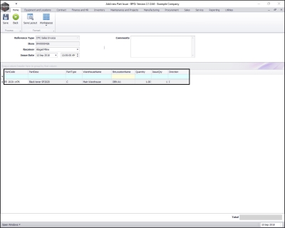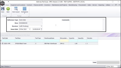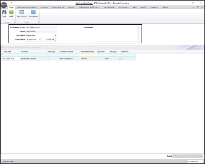 - For more information on how to issue parts in this screen, refer to Part Issue - C class items and Part Issue - A/B class items .