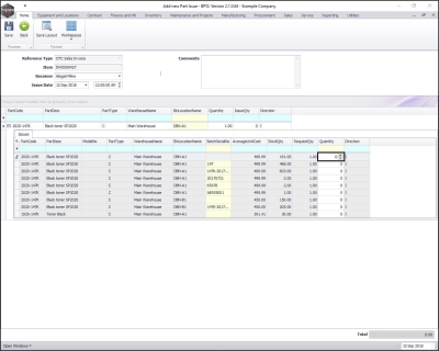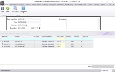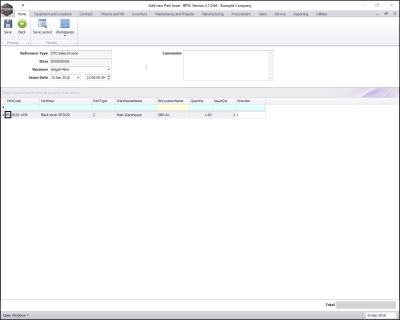 - The Issue Qty text box will auto populate with the quantity requested on the initial part request that can be issued out from the default warehouse (if there is stock available in this warehouse) but you can edit this.