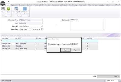 - Click on Yes if you want to print the part issue report and No if you do not want to print the part issue report.