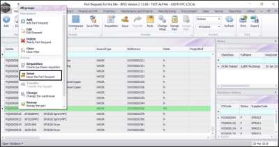 - The Parts data grid will contain only the part requested on the initially selected Part Request. For information on how to issue items, refer to Part Issue - C class items and Part Issue - A / B class items.