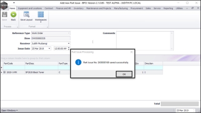 - Note: This pop up message might be displayed within the Part Issue Note screen or Add new Part Issue screen.