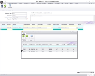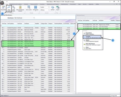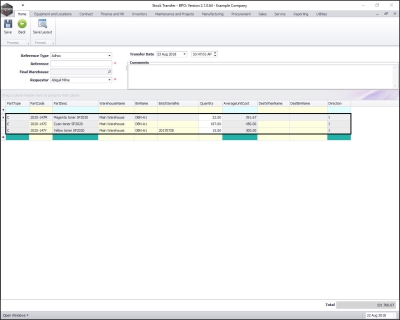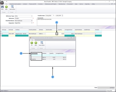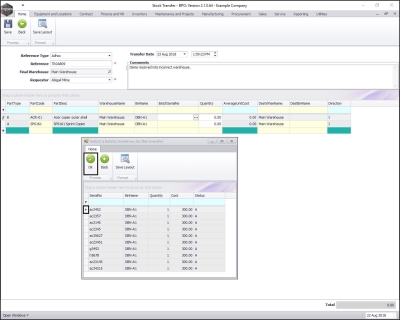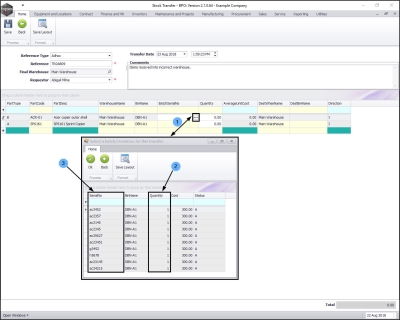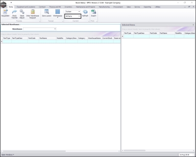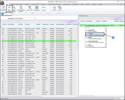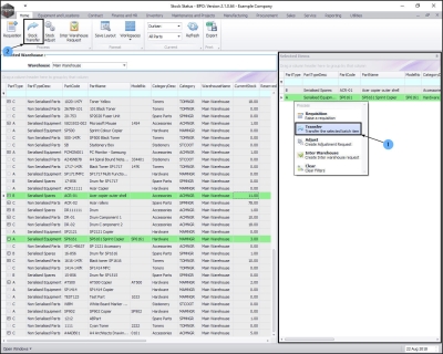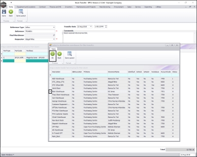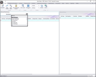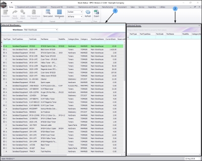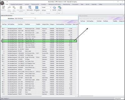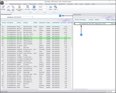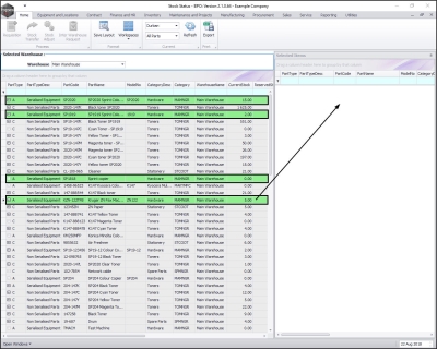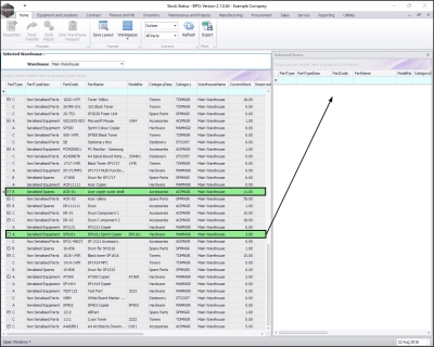 - The Selected Warehouse frame will now be populated with the stock details of all the parts / equipment items linked to that warehouse.