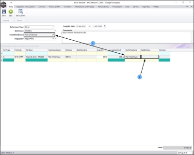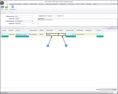 - Note: If there is only 1 bin linked to the final warehouse then the Dest Bin Name field will also populate with that 1 bin name. If, however there are 2 or more bins linked to the Destination Warehouse than the system will leave the field blank for you to make the correct bin selection.