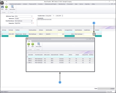 - In the Selected Warehouse frame, click and hold anywhere in the row of the item line that you wish to transfer.