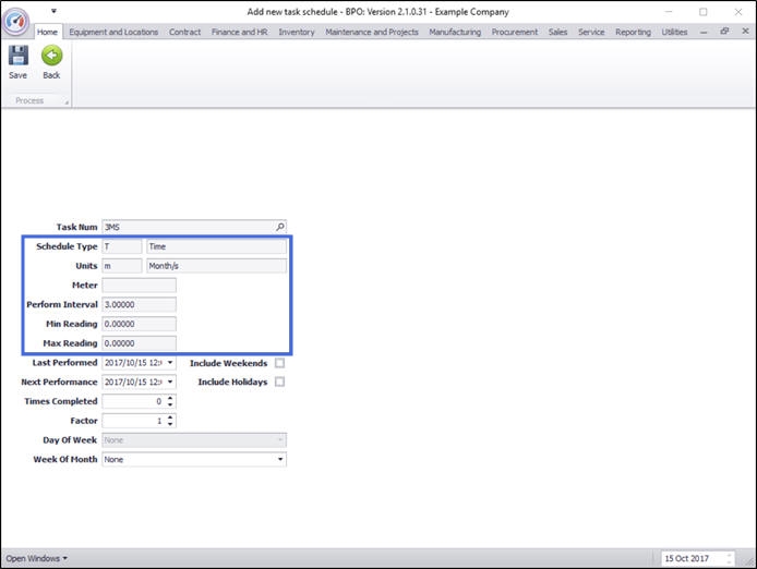 - The Schedule Type, Units, Meter, Min Reading, and Max Reading fields will populate automatically according to your Task Num choice.