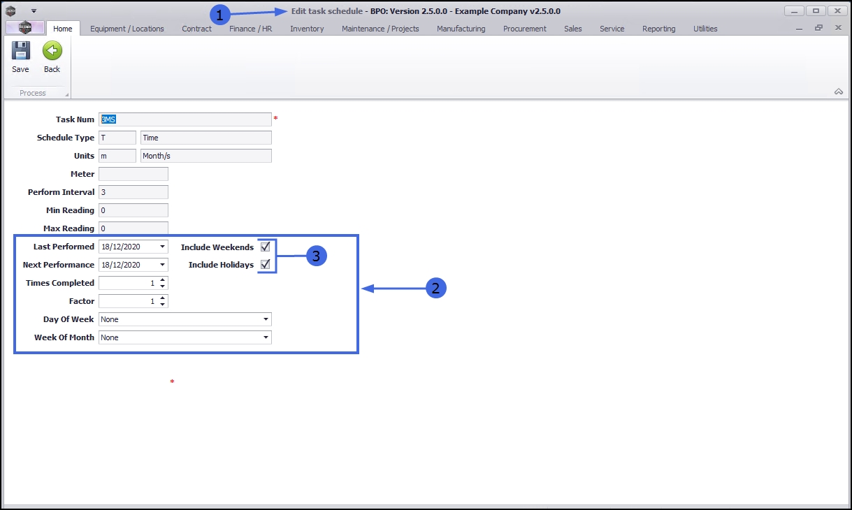 - In this example, both the Include Weekends and Include Holidays check boxes have now been deselected, indicating that tasks can no longer be performed on those days if the scheduled task date should fall on either a Saturday or Sunday or on a public holiday.