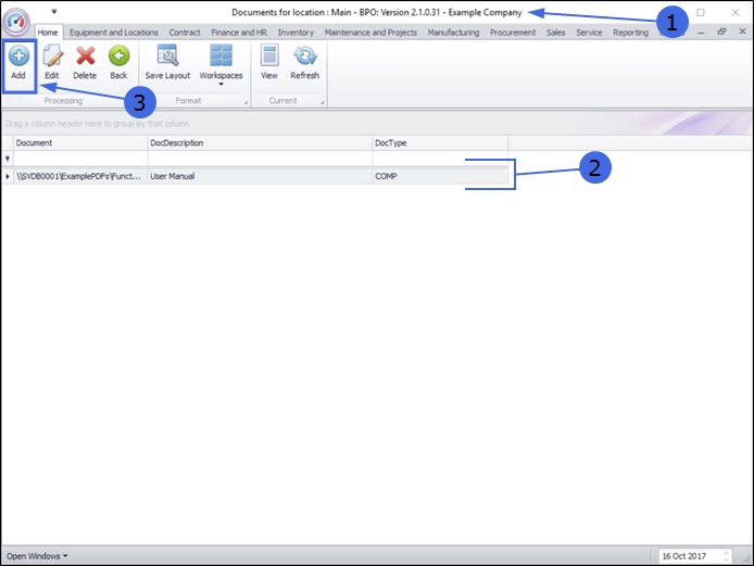 - If the documents are to be linked to a main location, select the row of that main location. In this example Upper Highway Area is a main location.