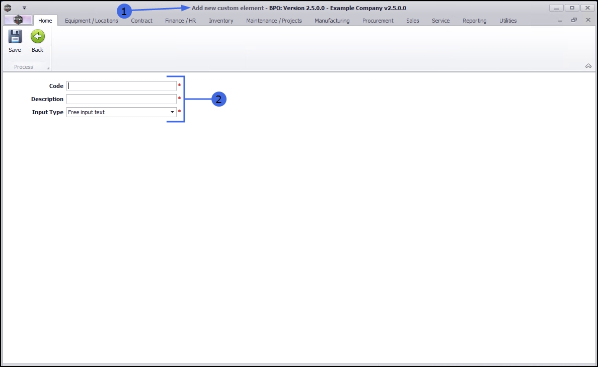 - Input Type: Type in the input type for this element e.g. Free input text, Lookup list, Yes or No value.