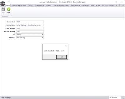 Production Centres - Add a Production Centre