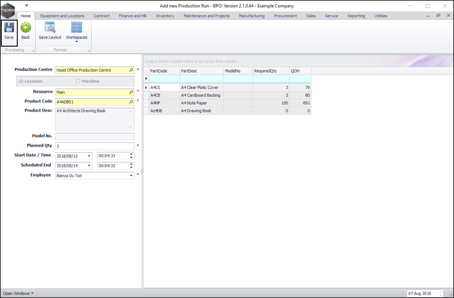 - When you have selected the Planned Quantity amount, the Parts data grid will now populate with the Required Quantity needed to complete the production run.