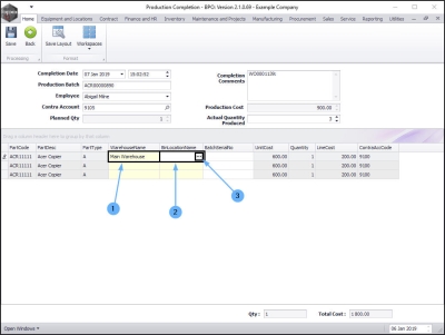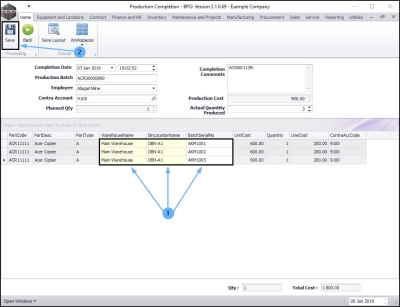 - Here you can view the Main Warehouse, DBN-A1 Bin contains 2 items with the batch number as set up in the production run.