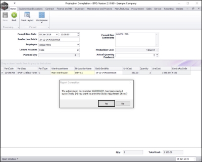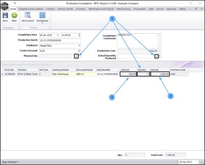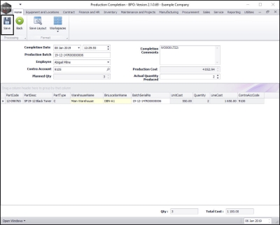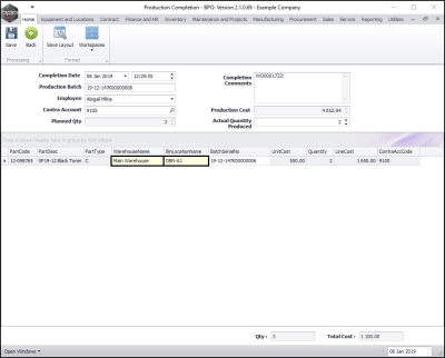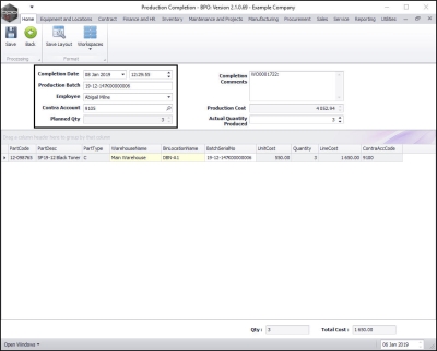 - In this example, you can see that the Actual Quantity Produced is the same as the Planned Quantity and this is also reflected in the Quantity column in the parts data grid.