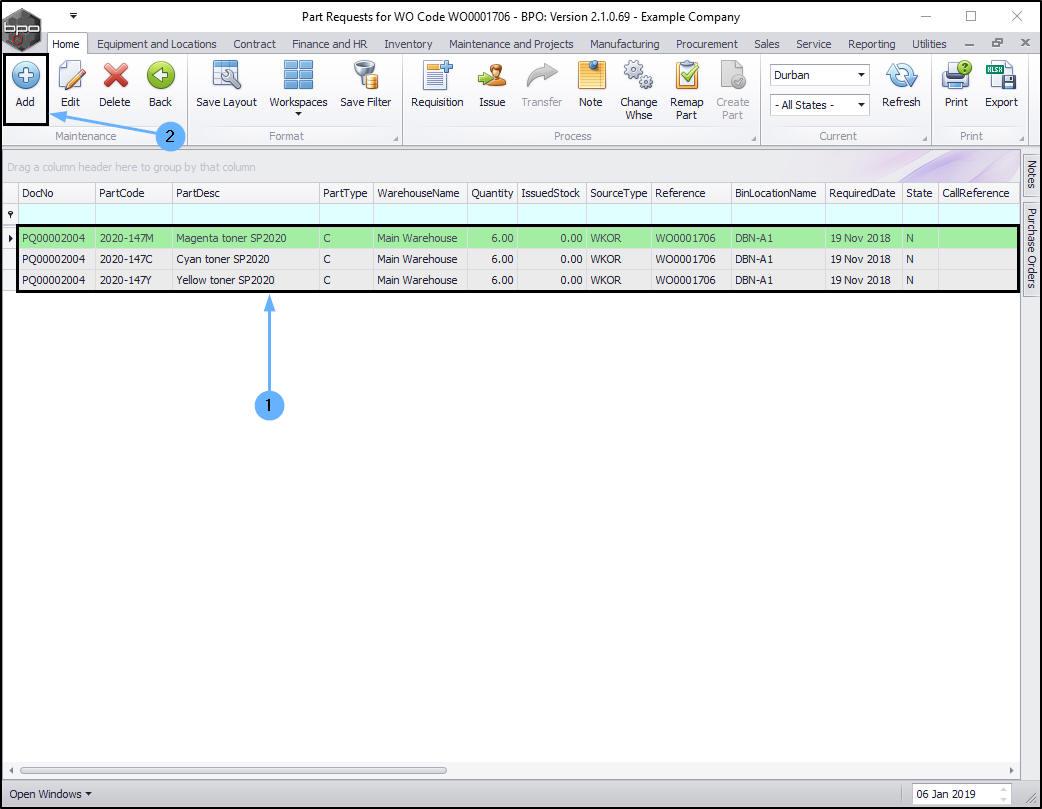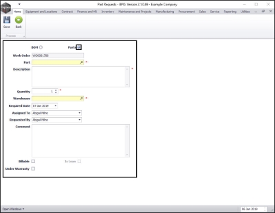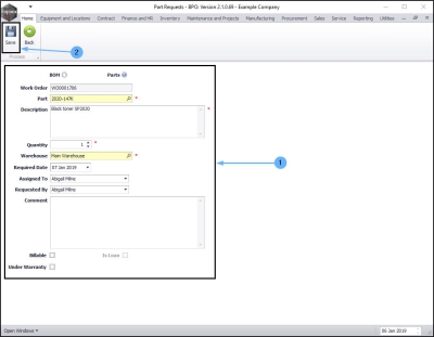 • When you have added all the required details to the Part Requests screen, click on Save.