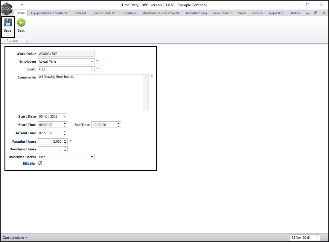 - When you have finished adding the labour time details to this screen, click on Save.