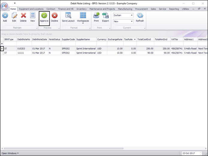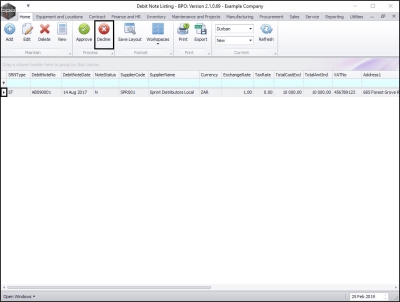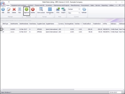 - Click on the row selector in front of the Supplier Debit Note to be approved.