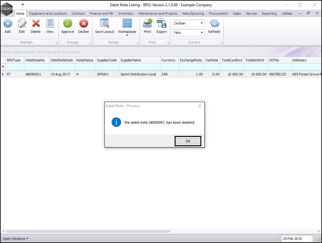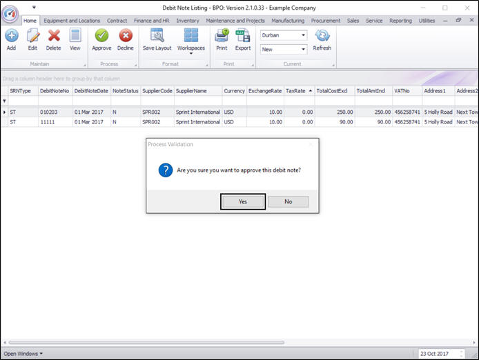 - A Debit Note - Process message box will pop up informing you that;