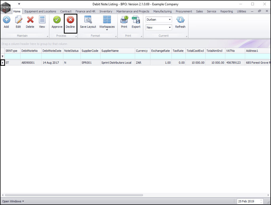 - Click on the row selector in front of the Supplier Debit Note to be rejected/declined.