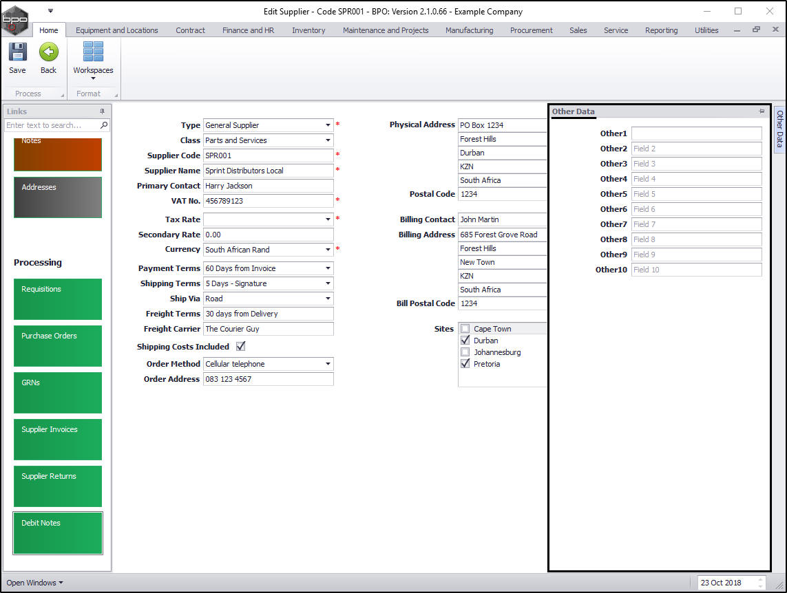 - Here, there are 10 fields where you can type in additional information pertinent to this supplier. These additional data labels (Other 1, Other 2 etc.) can be re-named as per your company's requirements.