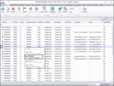 - Either click on the relevant button in the Action Button Toolbar or right click anywhere in the row of that requisition to display the pop up Process menu.