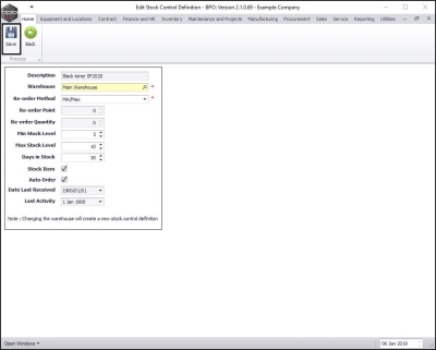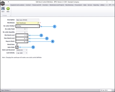 - The Re-order Method needs to be set-up as min/max and a min and max stock quantity needs to captured.