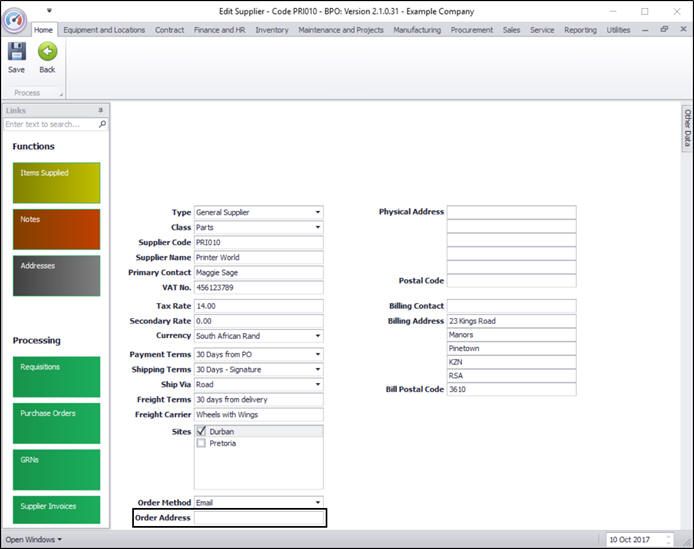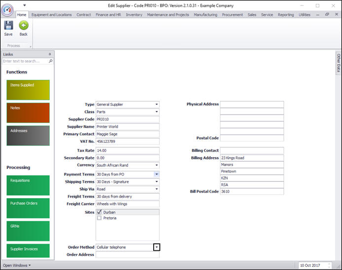 To create a purchase order, an Order Method must be set up on the supplier, this will be the preferred method of ordering items and/or services.