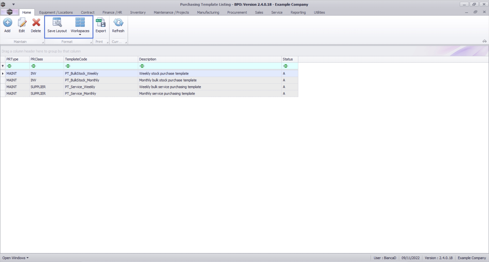 The ribbon action buttons will be available (bold) or unavailable (greyed out) depending on the status selection, and security right access level. The following functionality is available from this screen: