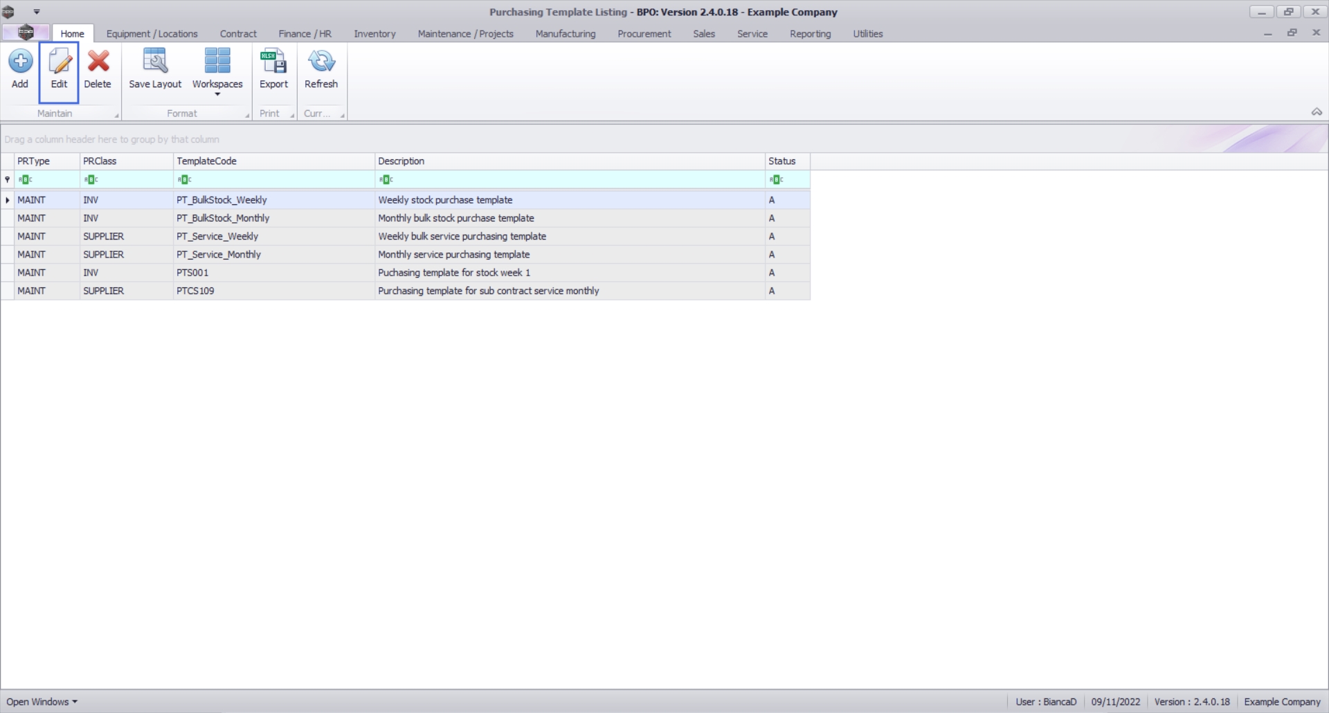 The Purchasing Template Maintain screen will open with the Type and Class pre-populated as noted below. These values cannot be changed.