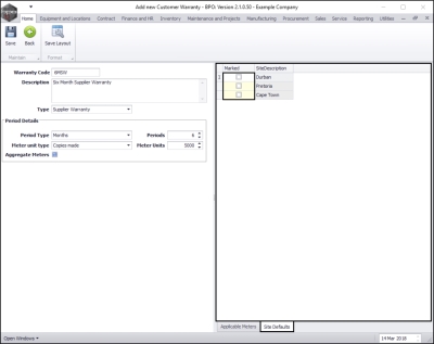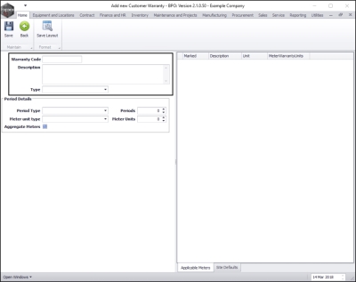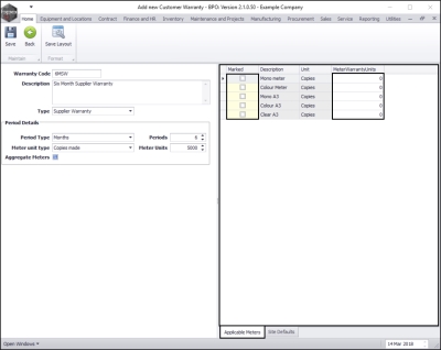 - Note: If Meters are not required to be linked to this warranty - move on to the Site Defaults frame at this point.