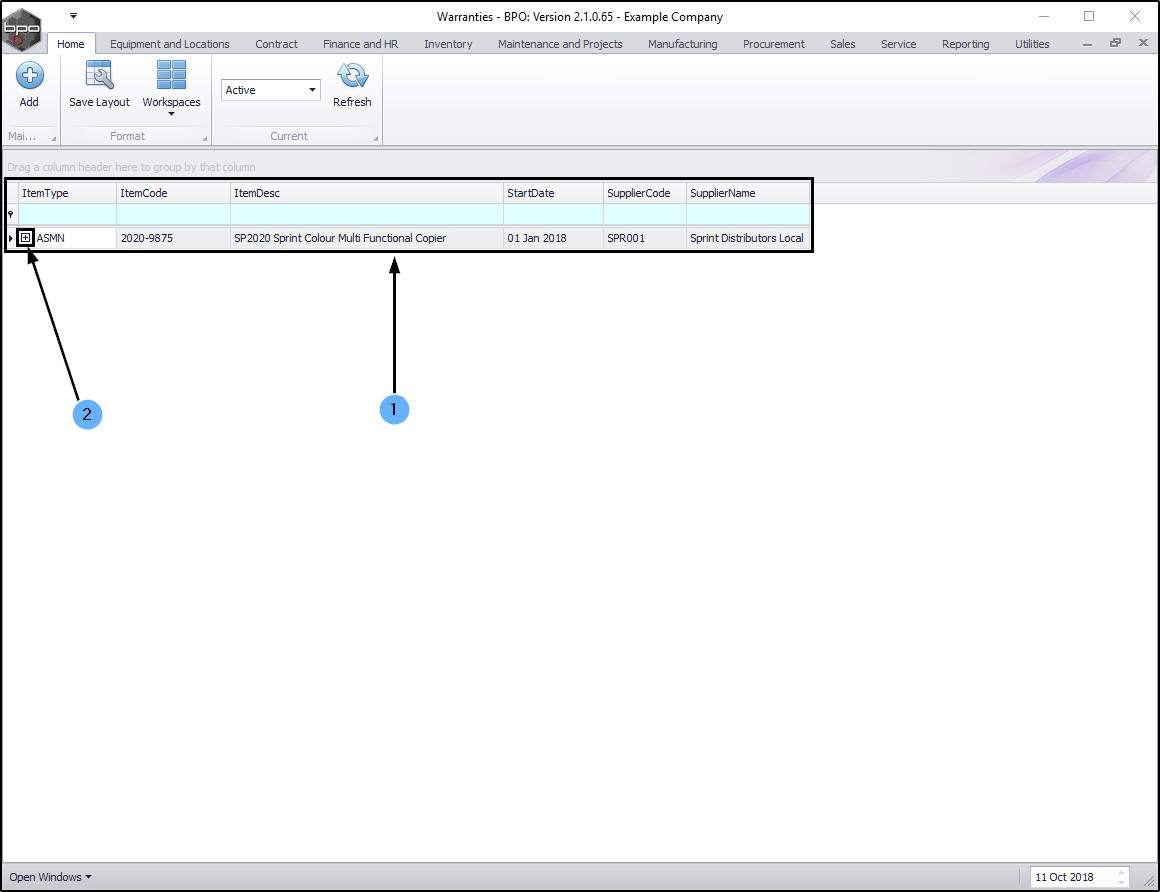- Click on the row selector in front of the warranty that you wish to view the details of.
