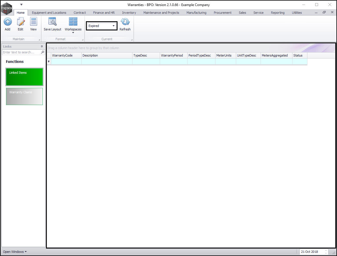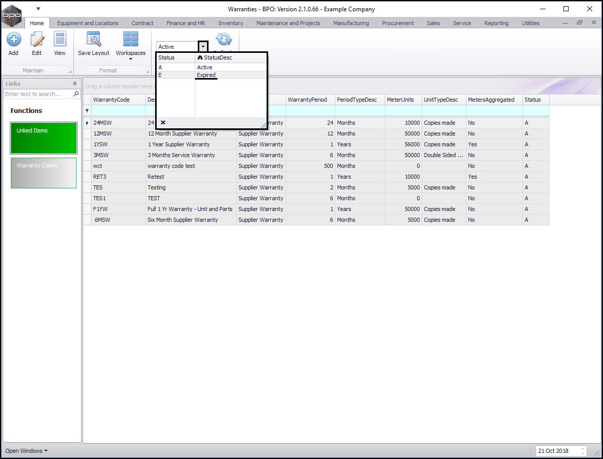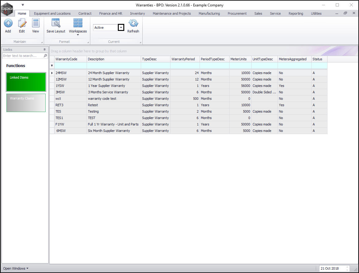 In the Warranties listing screen you can view all the Active and Expired warranties on the system.
