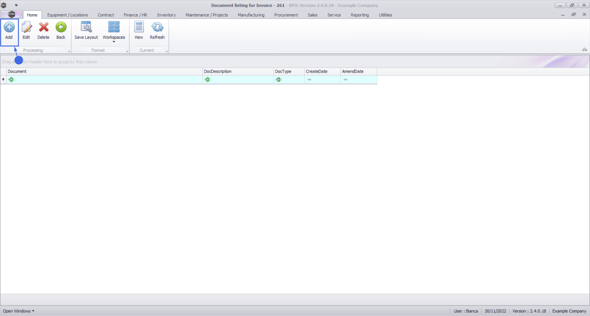The Document maintain screen will be displayed.