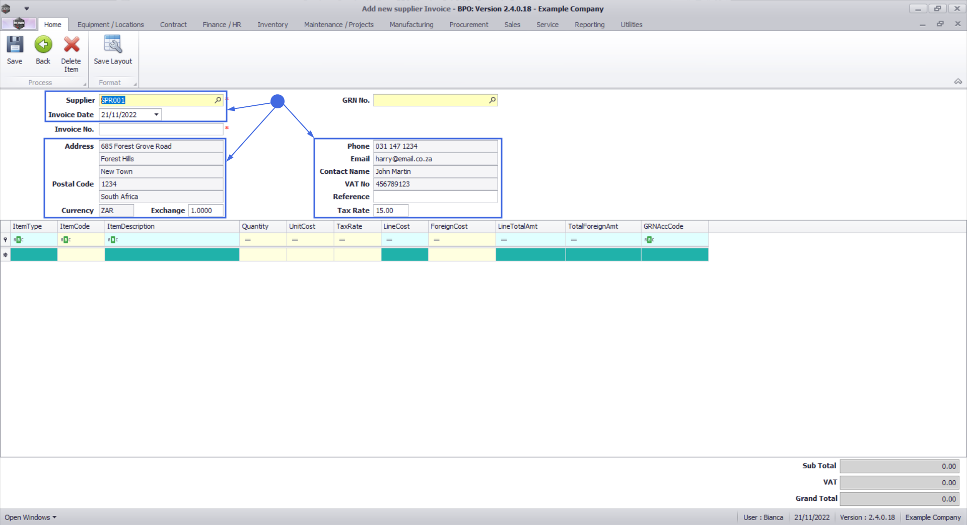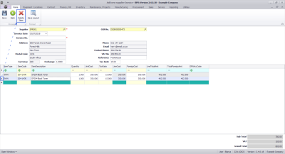 The Supplier Invoice header fields will populate with the Supplier Details and Supplier Invoice Date.