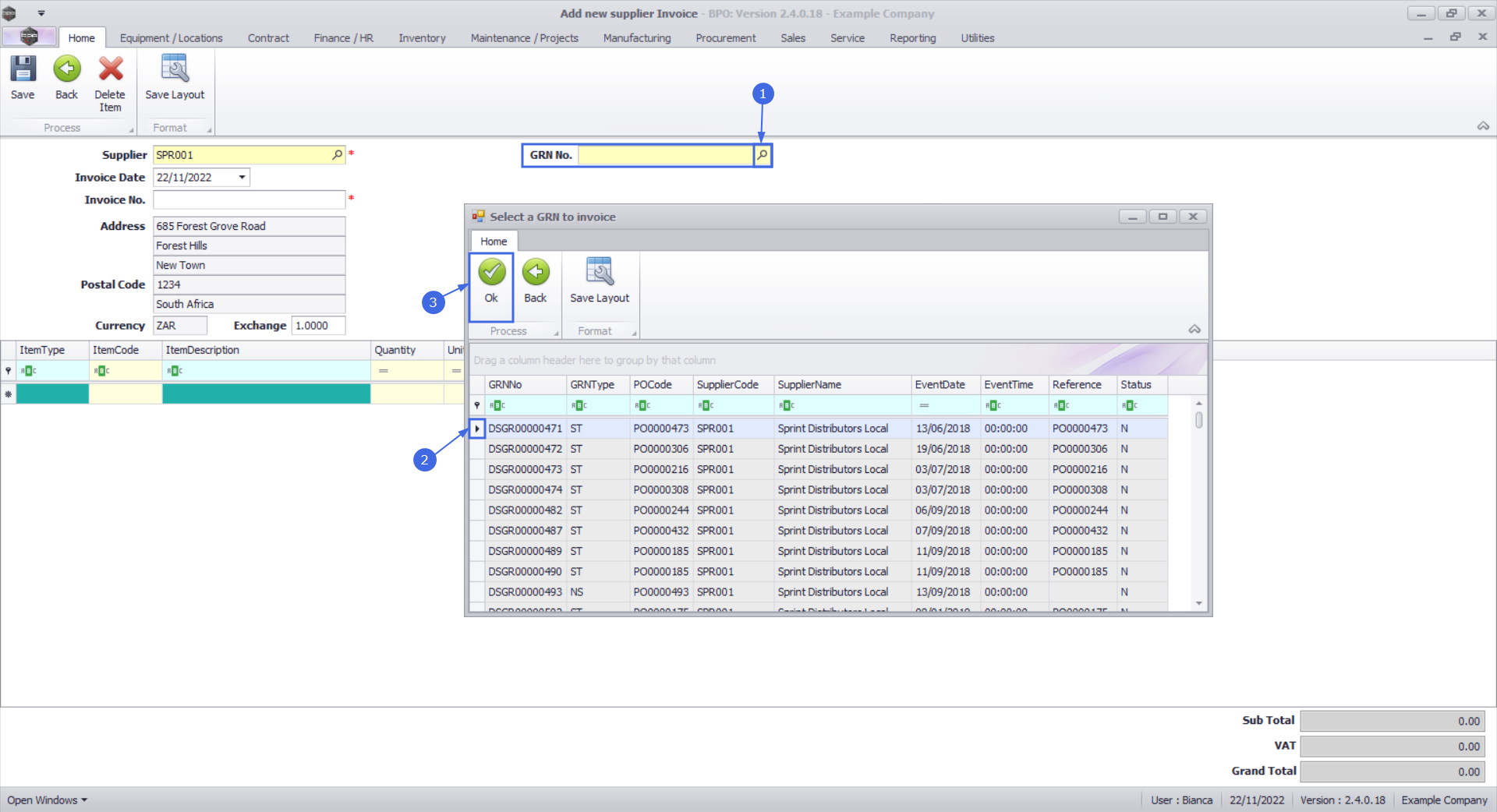 • Search for and select the GRN No.. This list will only display GRNs that are available for generating a Supplier Invoice.