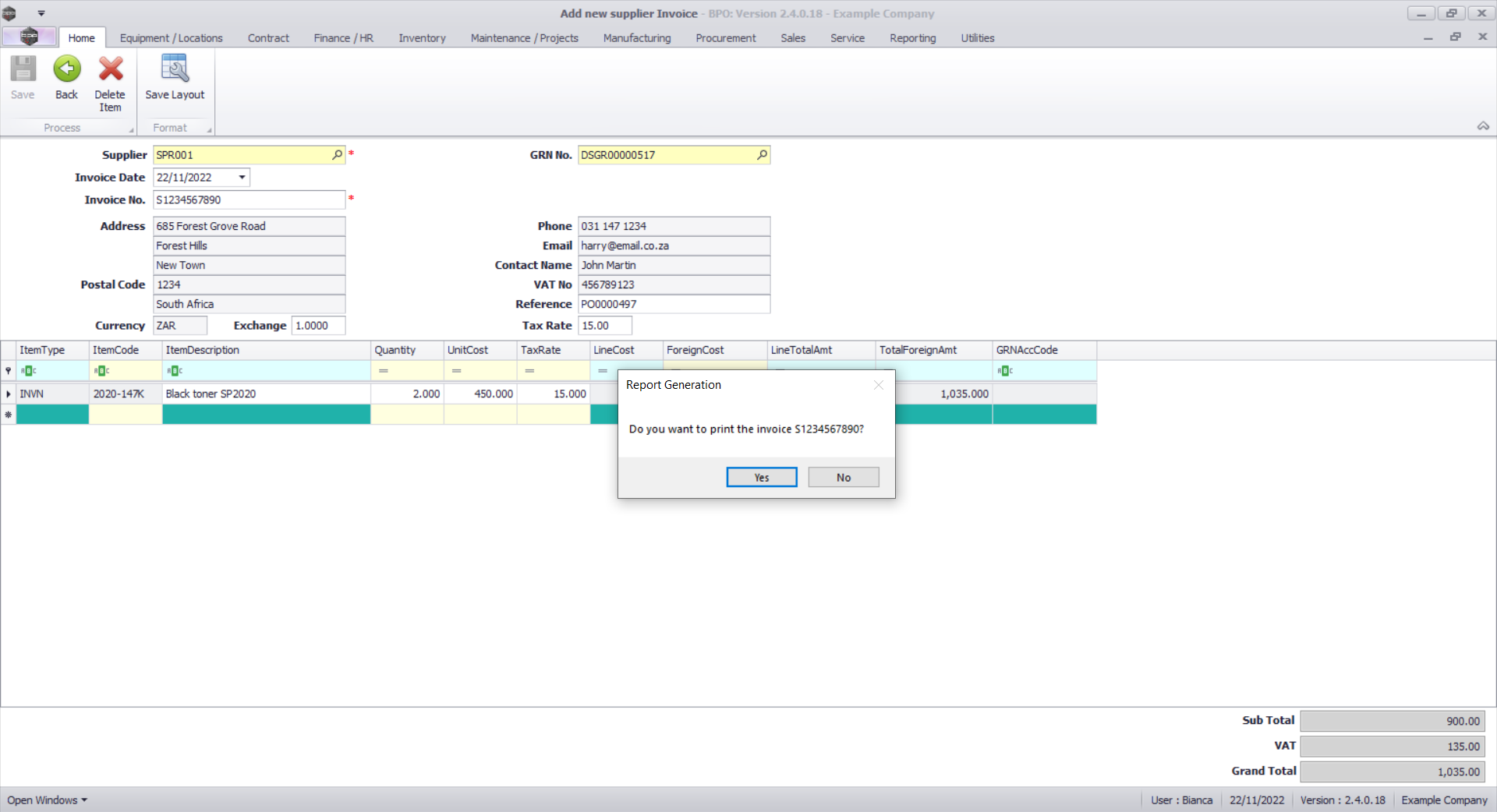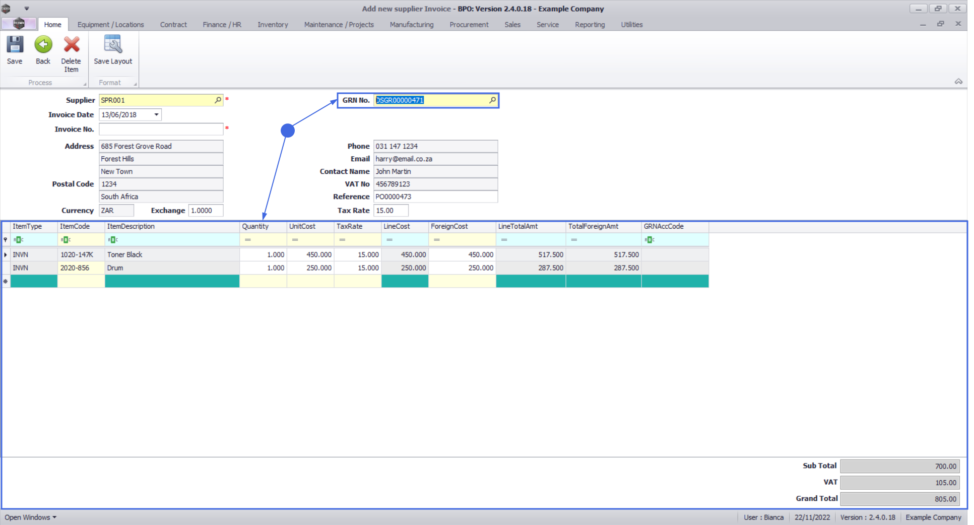 This will populate the GRN No. field and the Supplier Invoice Items and Totals.