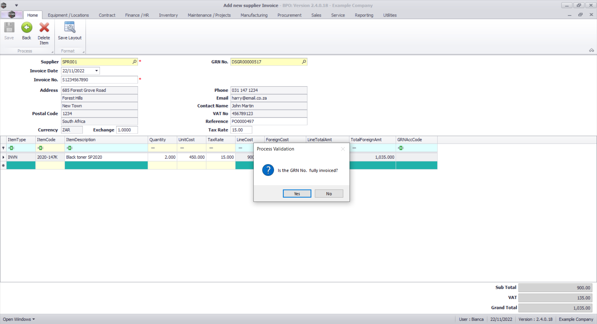 A message box will come up asking: Is the GRN No. fully invoiced?