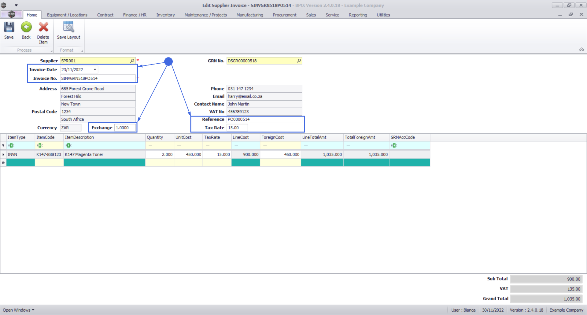 - Invoice Date, Invoice Number, Exchange Rate, Reference and Tax Rate.