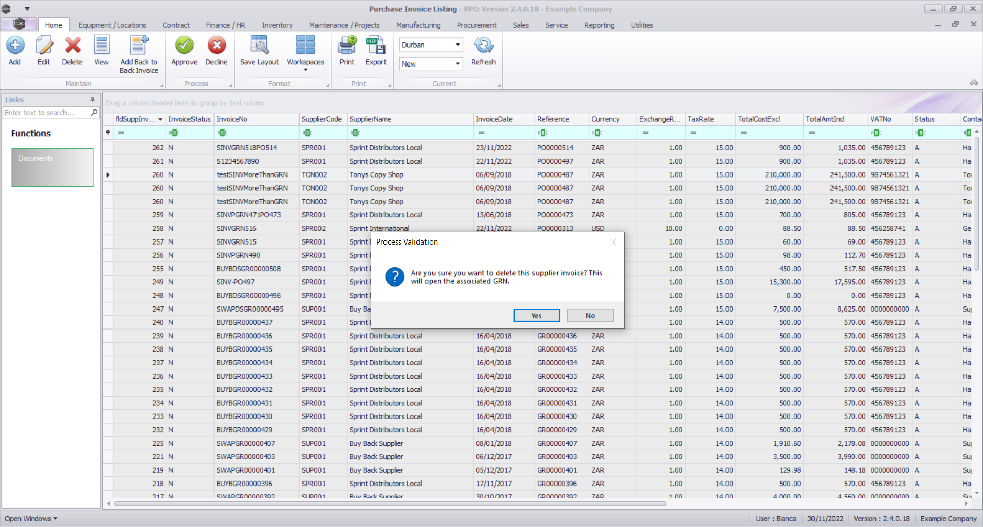 A message box will come up asking: Are you sure you want to delete this supplier invoice? This will open the associated GRN?