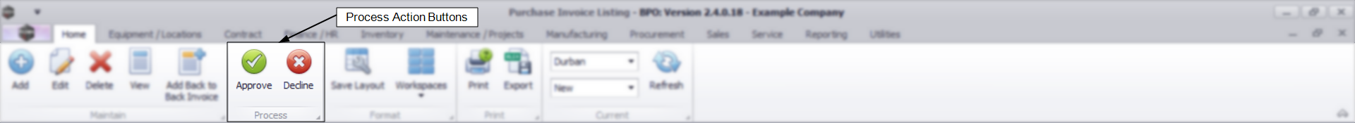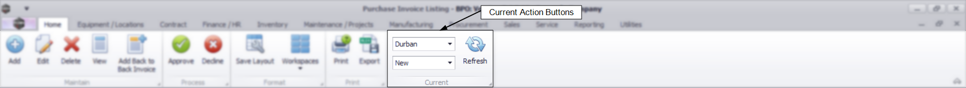 The ribbon action buttons will be available (bold) or unavailable (greyed out) depending on the status selection, and security right access level. The following functionality is available from this screen: