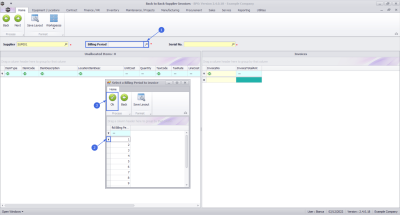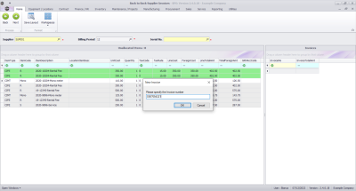 The screen contains two data grids - the right grid will contain the Invoice Header where you will be prompted for an Invoice Number and the left grid contains a list of the available fee and / or meter line items, which populates once the Supplier has been selected.
