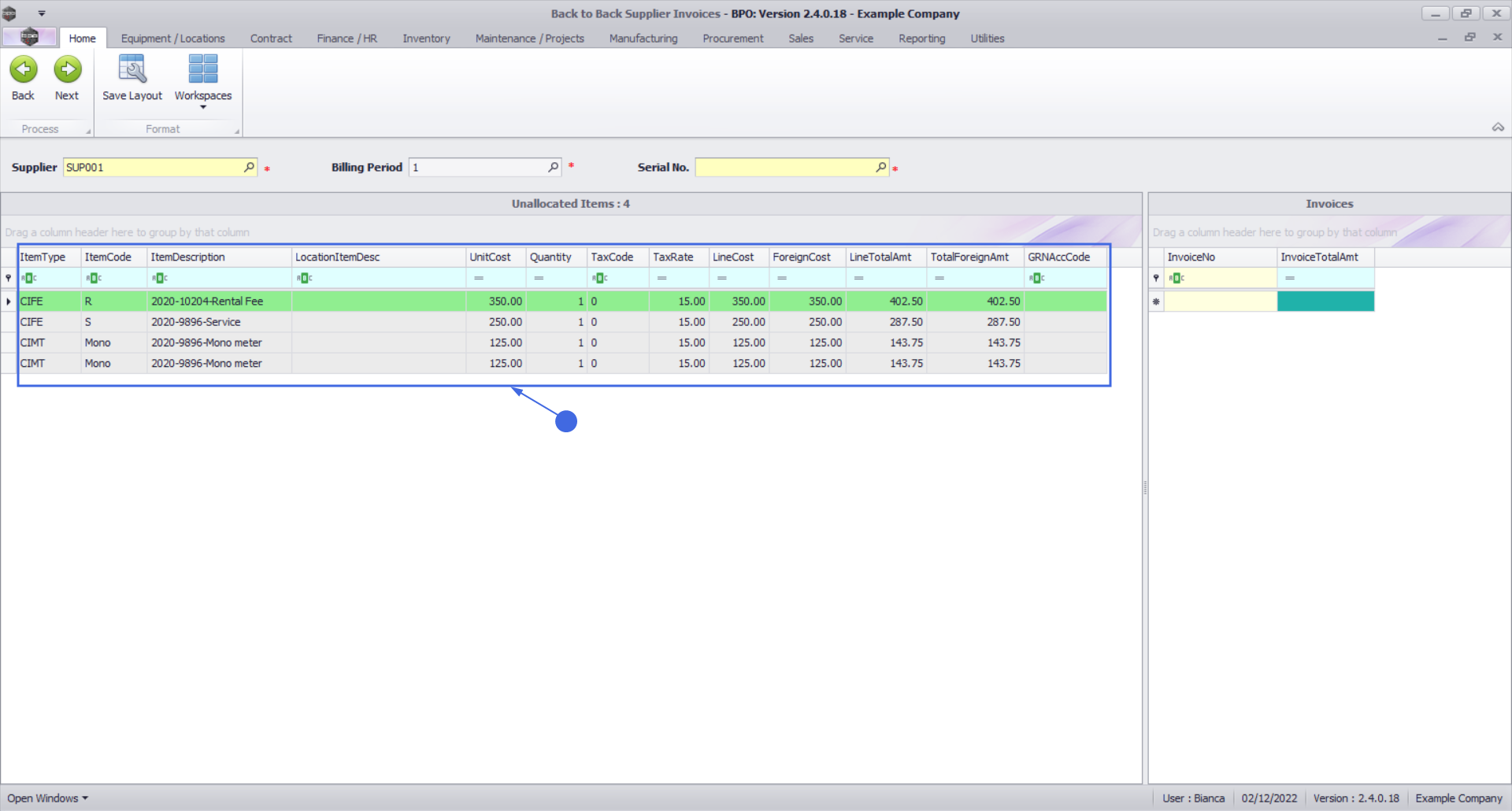 The Back to Back Supplier Invoice maintain screen will be displayed, where the Supplier / Finance Party and Billing Period must be selected. You can optionally further filter the items by Serial Number.