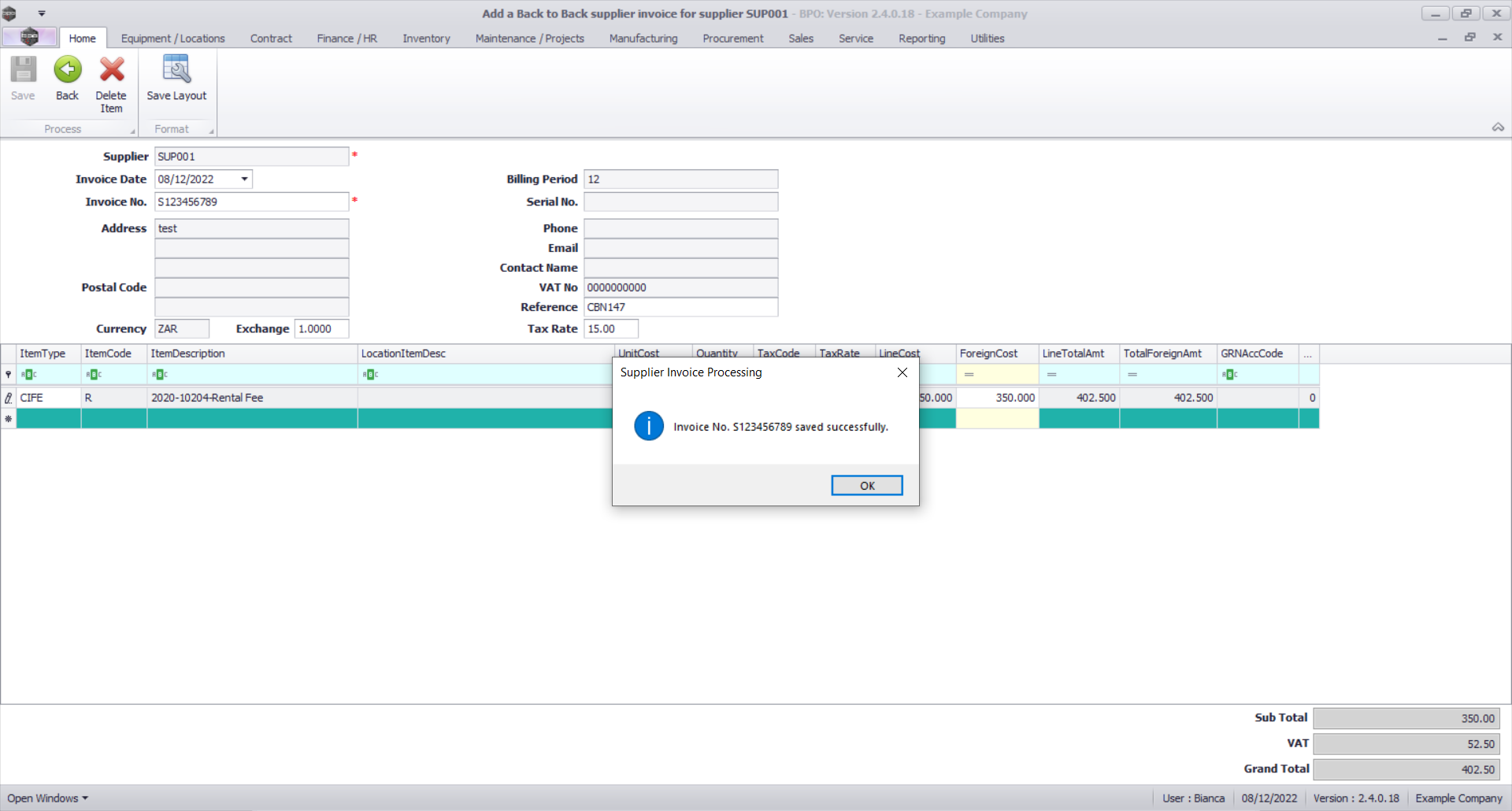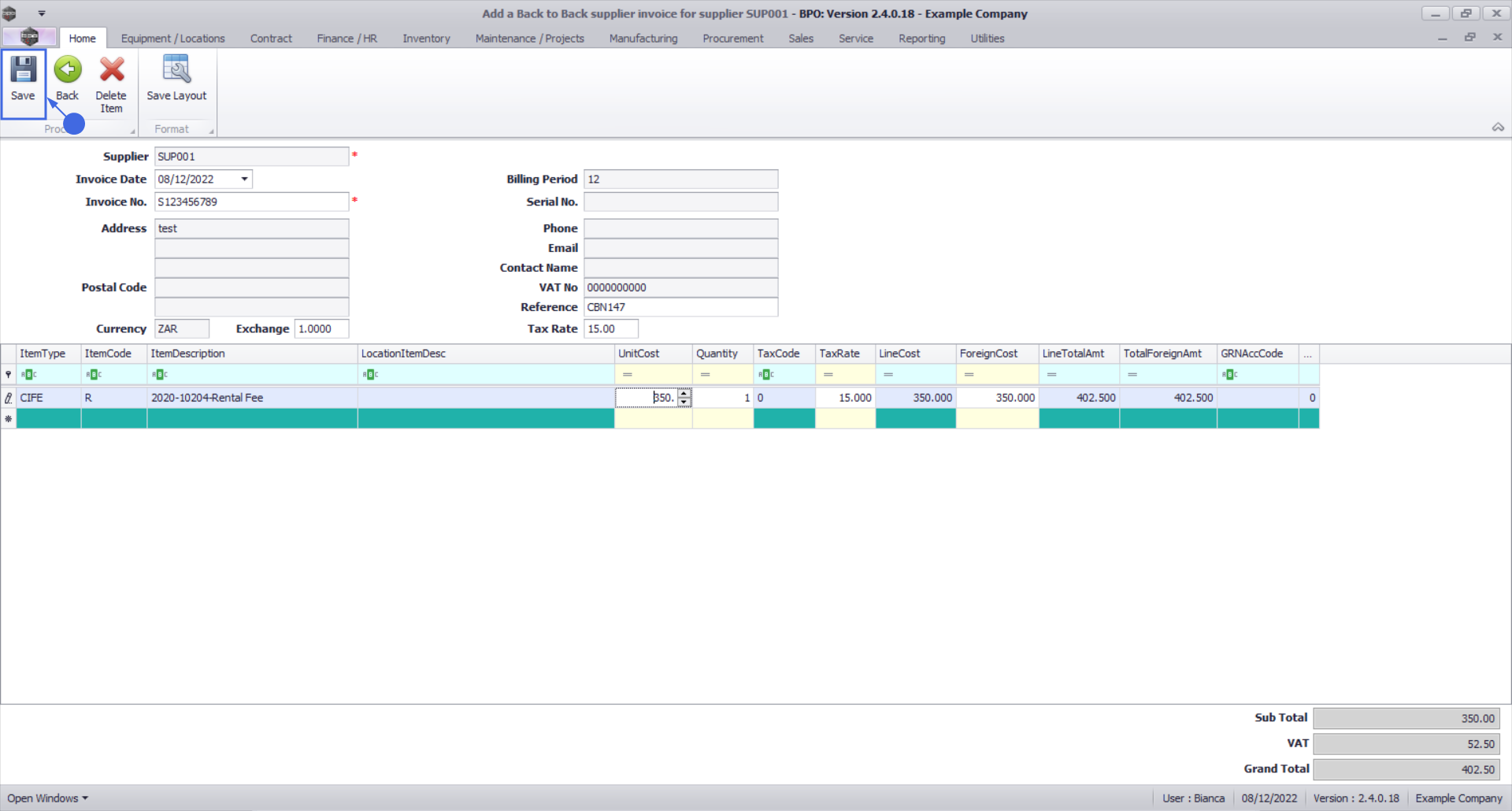 You will see the Back to Back Supplier Invoice maintain screen for the Invoice header you created previously. If you created multiple invoice headers, you will see the details for the first Invoice Header.