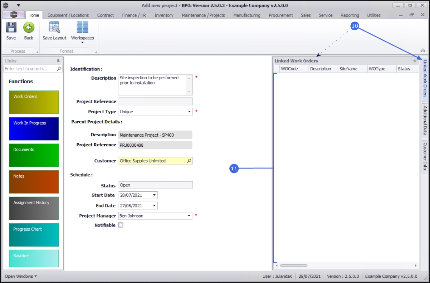 - The Customer Info frame will auto populate with the customer information you have selected as the Parent Project Details.