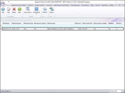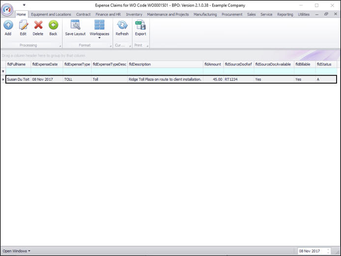 - You will return to the Expense Claims for WO Code [ ] listing screen where you can now view the added expense claim.
