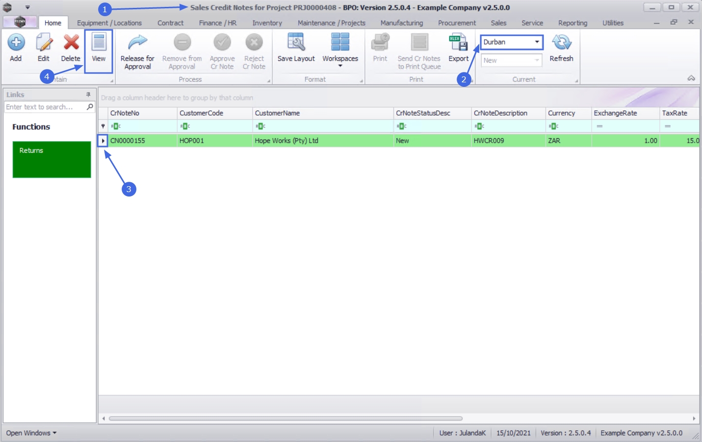 • When the Credit Note is issued from the Call Screen or the Project Screen then theCredit Note Returns needs to be viewed from the Credit Note Returns tab on the Call Screen or the Project Screen.
