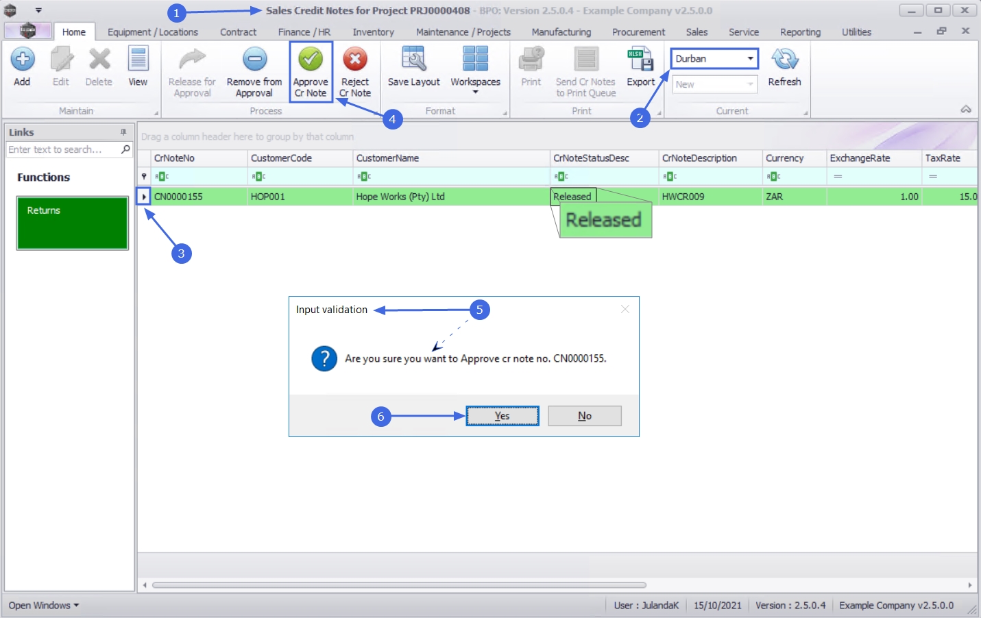 • Are you sure you want to Approve cr note no. [CNcredit note number].