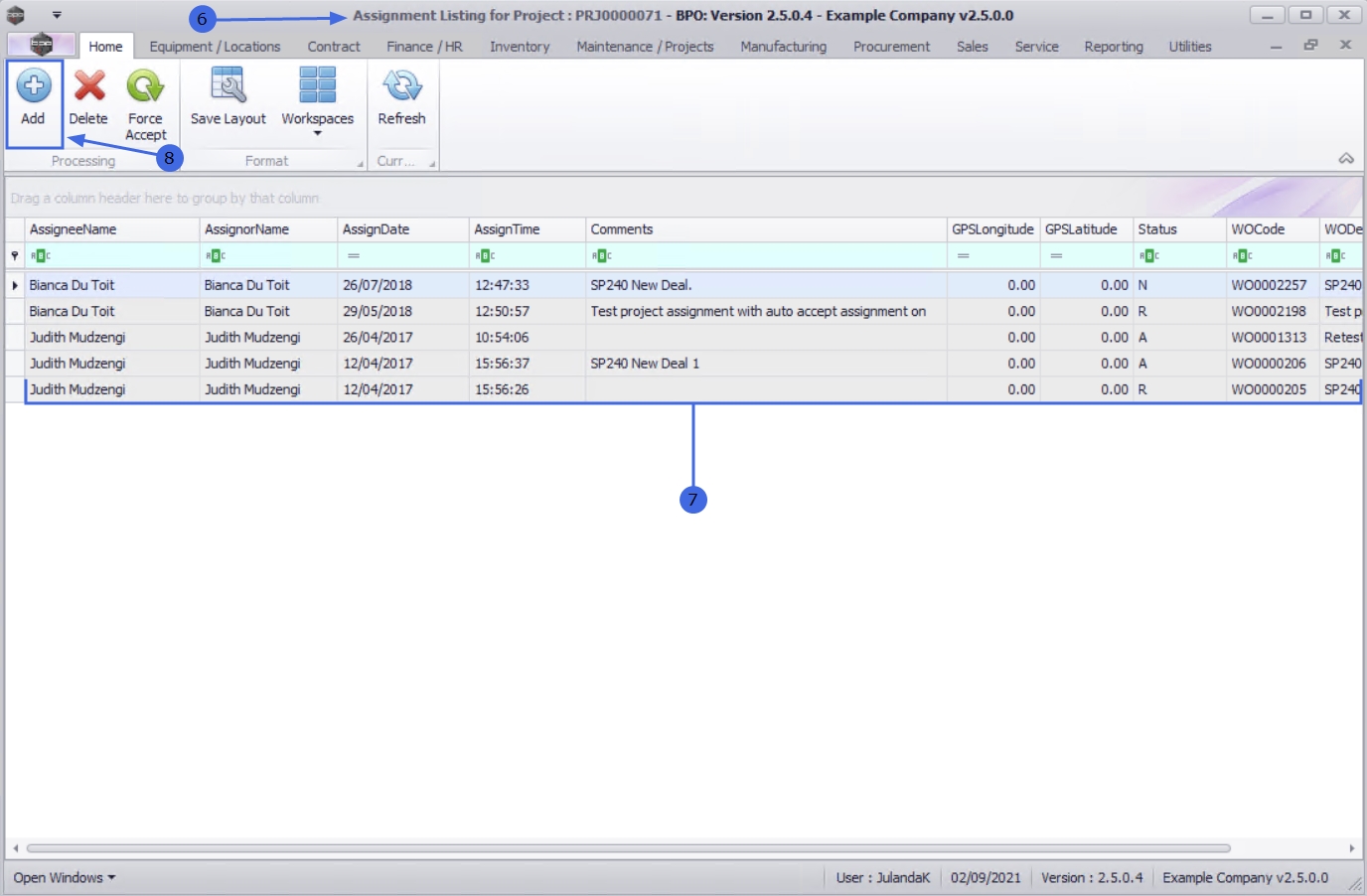Note that the Status for the Technician selected in the Status Column is N - New. - Click on Force Accept.
