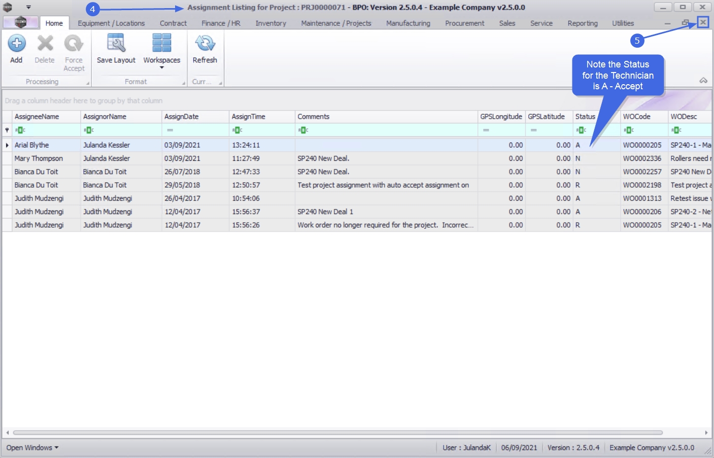 Note that the Status for the Technician that was selected in the Status Column has changed to A - Accept. - Close the screen to return to the Project Listing screen.