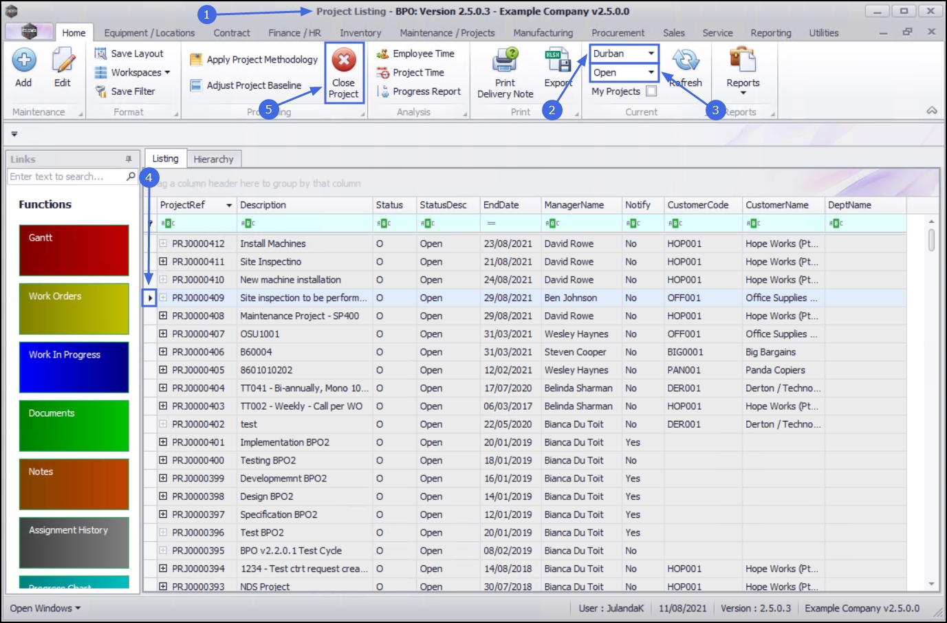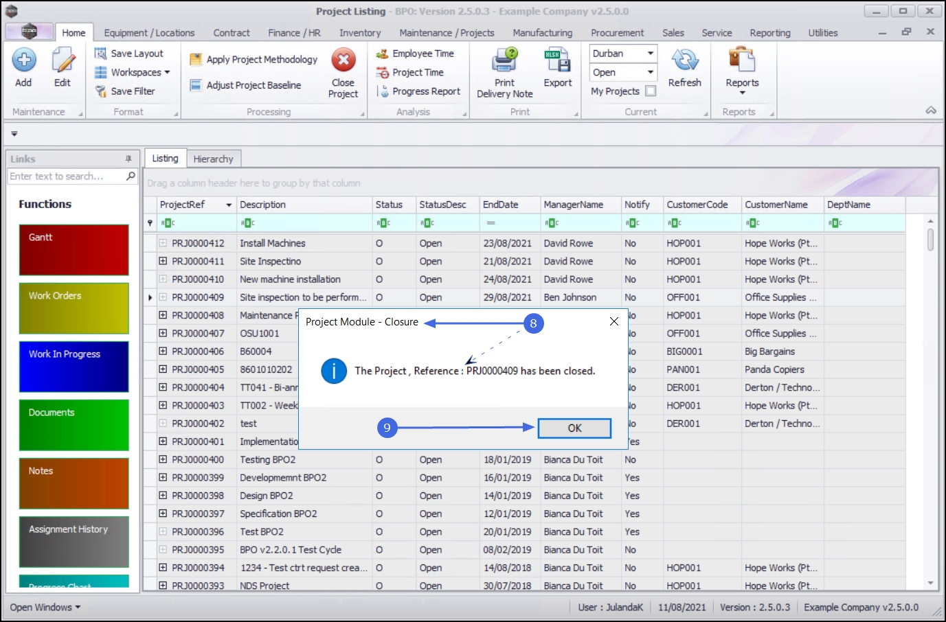 When the project has been completed and no further items are outstanding on the project, or the project is no longer required, it is ready to be closed. BPO will not allow you to close the project if outstanding billable items, loan machines, un-issued stock, etc. still reflect on the project.