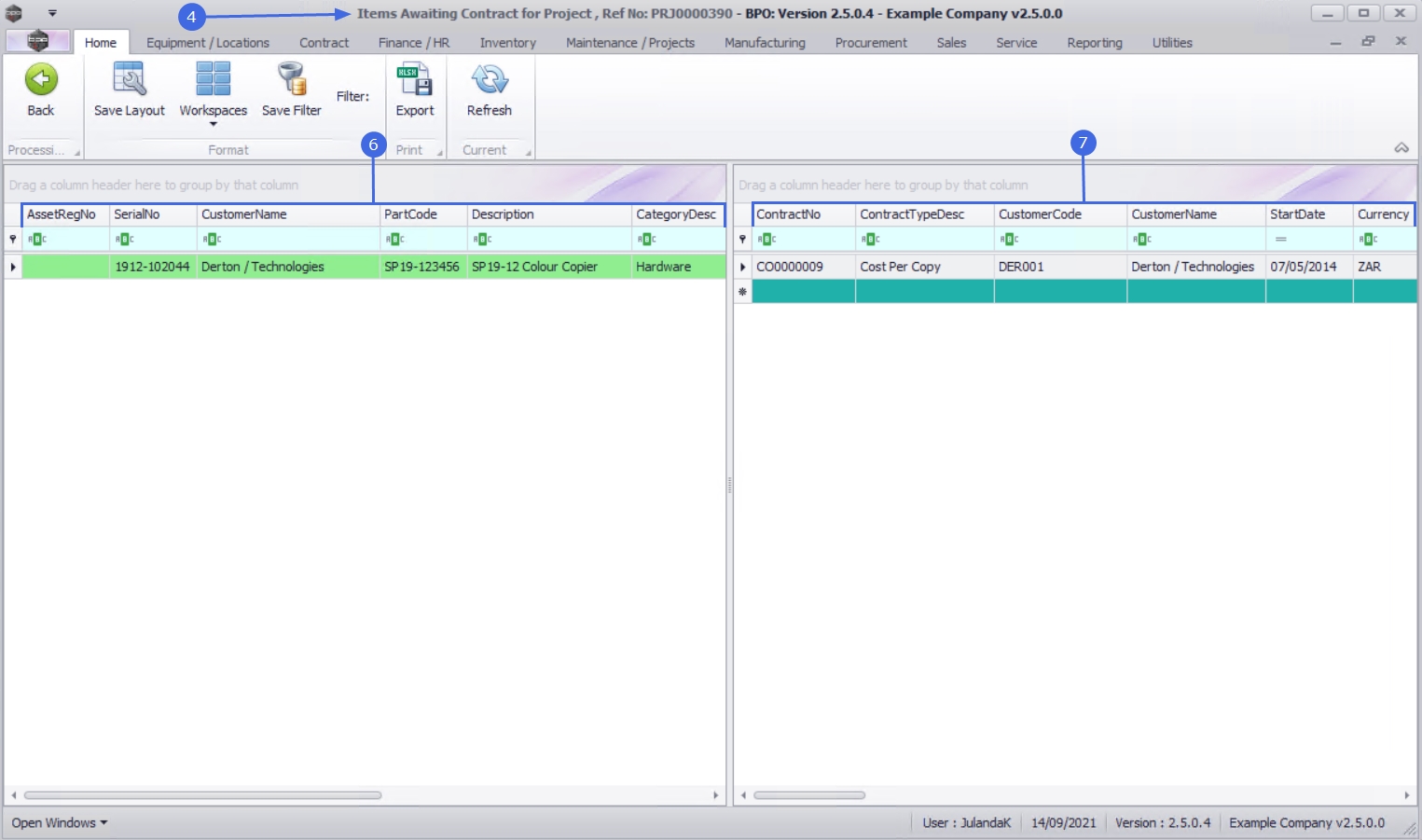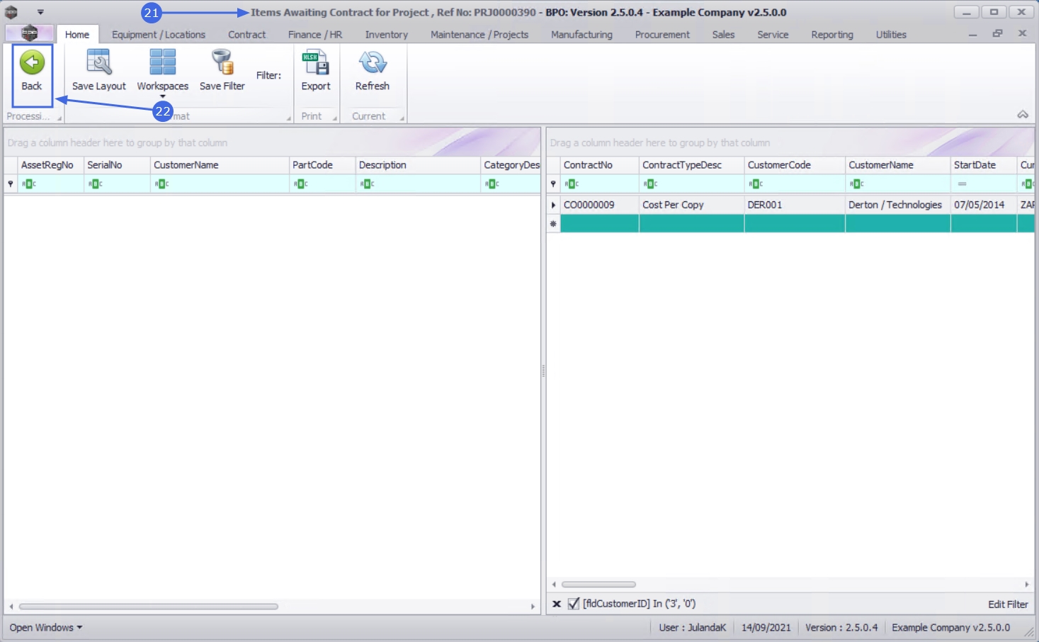 - Data grid 1: displays all the items linked to the selected project waiting to be allocated to a contract. These items can either be client assets or internal assets. For internal assets to be displayed, a New Deal Project process has to be completed first.
