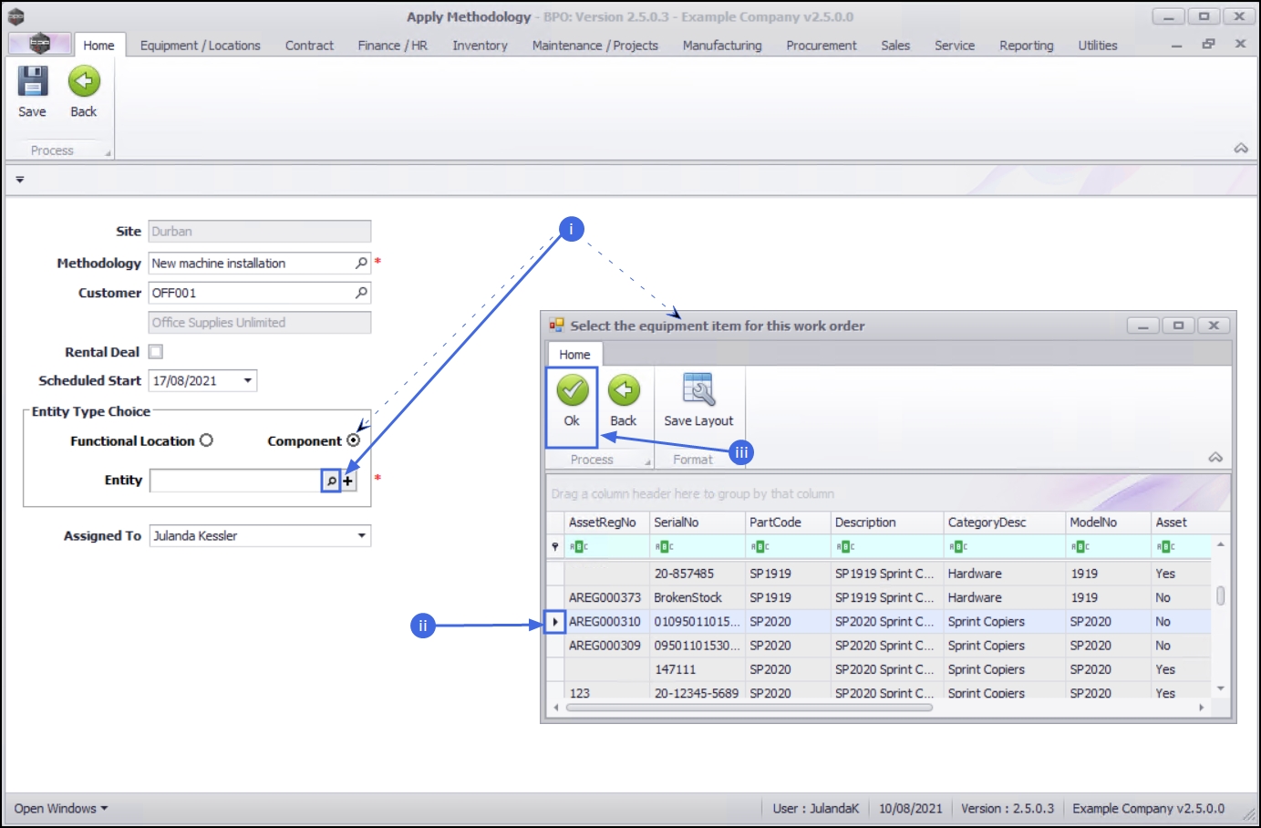- If the Entity Type was Component, then the Select the equipment item for this work order screen will display.